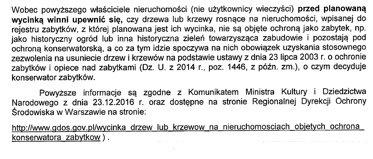 Przechodząc do meritum – Saska Kępa objęta jest nadzorem konserwatorskim (decyzja wojewódzkiego konserwatora zabytków nr 942 z 02/04/1979 – obszar ograniczony ulicami Wał Miedzeszyński, Al. Waszyngtona, Saską, Zwycięzców, Paryską i Ateńską), w związku z czym na obszarze objętym ochroną NIE ma zastosowania znowelizowana ustawa o ochronie przyrody (w sensie pełnej wolności właściciela nieruchomości do wycinania zieleni na jej obszarze), a tym samym KAŻDA wycinka zieleni wymaga UPRZEDNIEGO uzyskania zezwolenia na wycinkę od wojewódzkiego konserwatora zabytków.